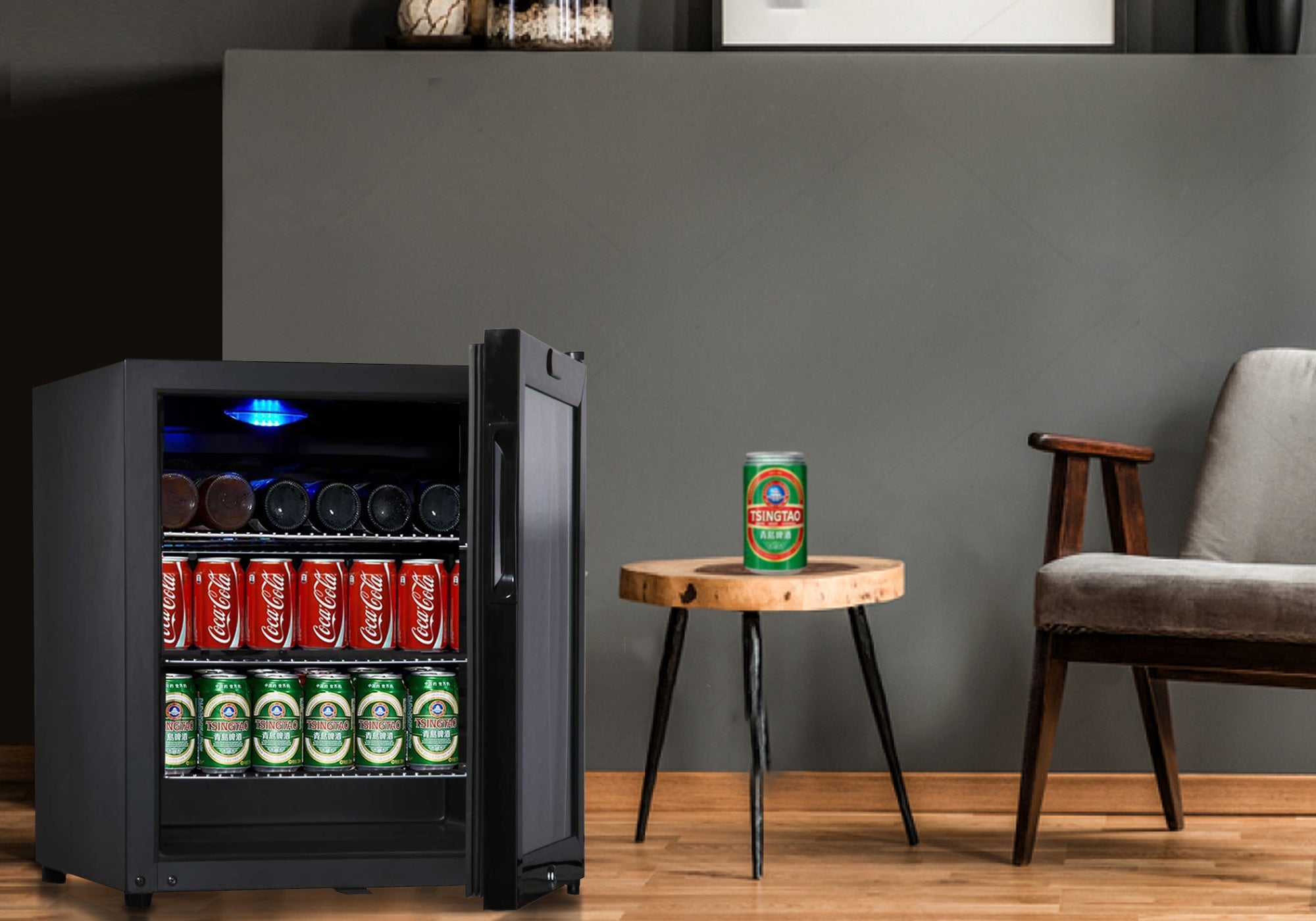 Looked for months to find the perfect one. We wanted the black inside for an aesthetic look. There aren't very many that offer this feature and allow for all different sizes of drinks. We didn't want a big commercial looking fridge in our hang out room. This can fit all of our bottle, cans and wine. Absolutely wonderful. the purple light inside has a nice look to it. We like our drinks cold and it gets down to 35.